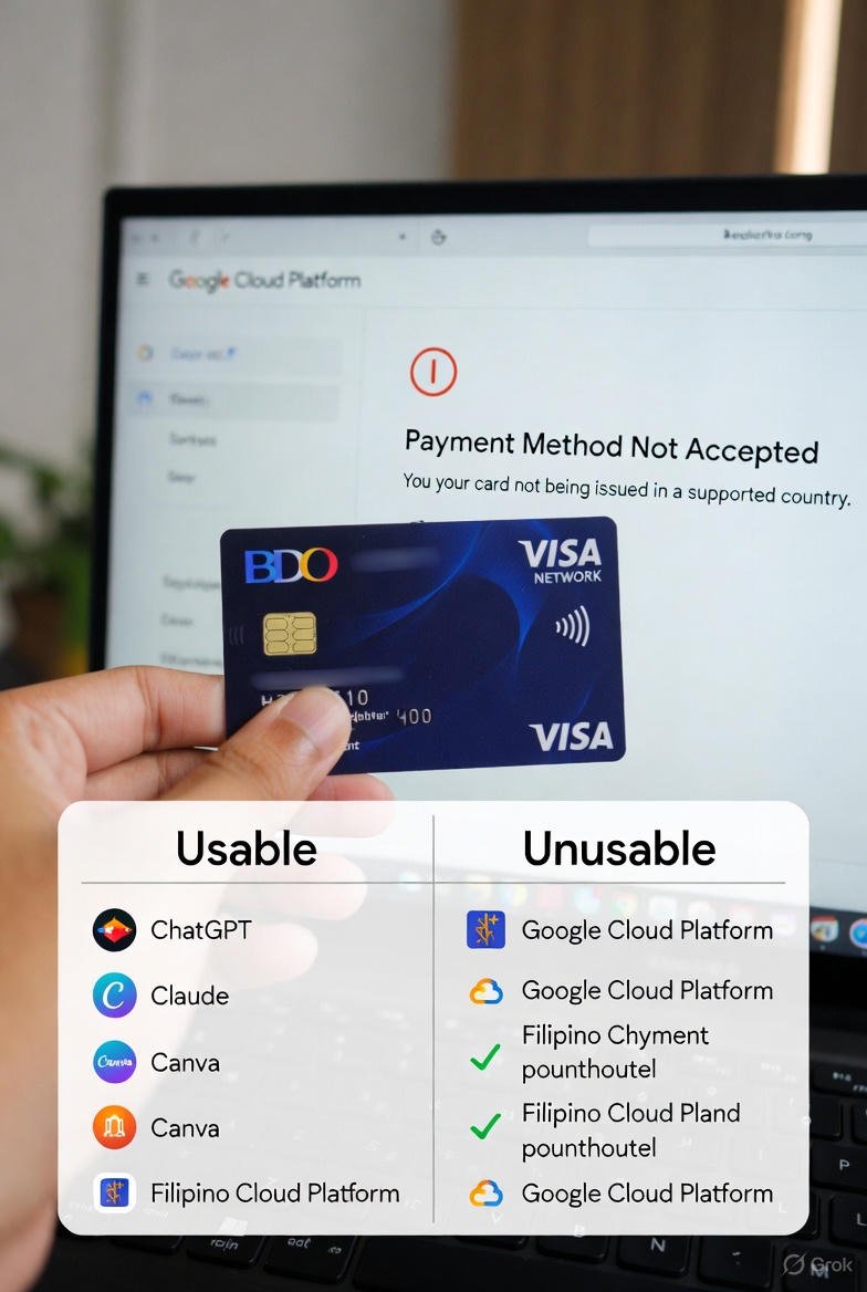 Her laptop is functional but not powerful. Her internet is Sky Fiber—25 Mbps down, 5 Mbps up, with occasional evening slowdowns. She has a BDO debit card, which works for some subscriptions but not others.