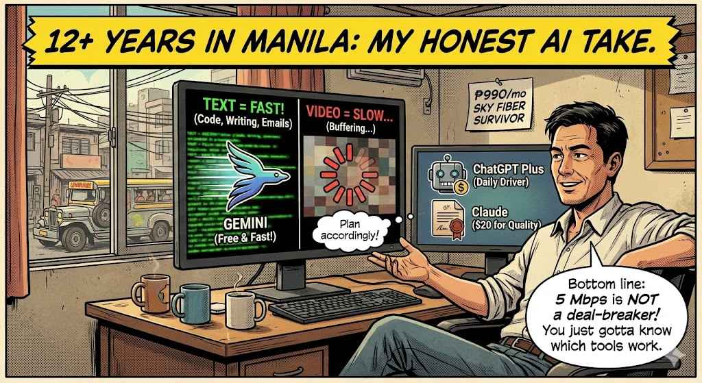 I’ve been living in Manila for 12+ years, and testing AI tools in this exact environment since ChatGPT launched in late 2022. This is not a marketing benchmark. This is what actually happens when you try to use ChatGPT, Claude, and Gemini on a real Manila internet connection.